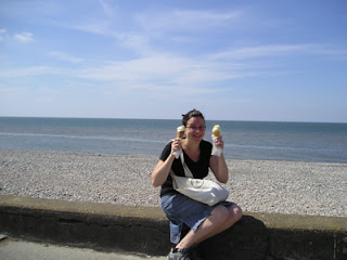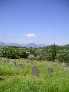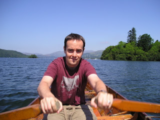 That all I’ve eaten save supper during the last few days are scones with jam and clotted cream, and I’ve consumed enough tea since Friday to float a boat. That we’ve had enormous fun in Lancaster, Cleveleys, and to the Lake District (to Bowness-on-Windemere, where Stuart rowed me in a boat and quothed original poetry, and Hawkshead, where more scones were eaten and a man was noted on his tombstone as “an observer of rainfall”). I have started a tea towel collection. The road into Hawkshead was so narrow we thought death was imminent, and everyone behind me honked as I had to stop whenever another car passed by. That we walked home yesterday skipping stones and collecting interesting pebbles. That it never rains in the North of England. That I haven’t driven into a hedge, stone wall or another vehicle, but I’ve driven into the curb, twice. That I have watched EastEnders and Two Pints. That I closed my English bank account and got £14. That both of us are going to come home with those famous Northern English sunburns. Tomorrow we’re off to Skipton.