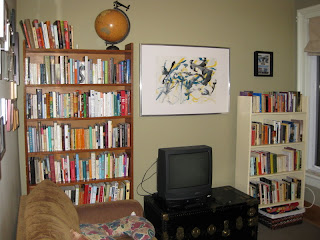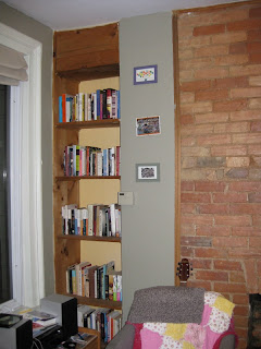And I realize that books have been missing from this room all along. It’s so nice to be back among them. The aesthetic effect of their various colours and heights. How the walls were empty before, and the floor just too wide, and how the built-in shelf beside the fireplace was wasted before now. It’s true, they do– they furnish a room! And joyfully, because televisions don’t, we’re getting rid of ours, so just excuse the focal point in the photo in the meantime.