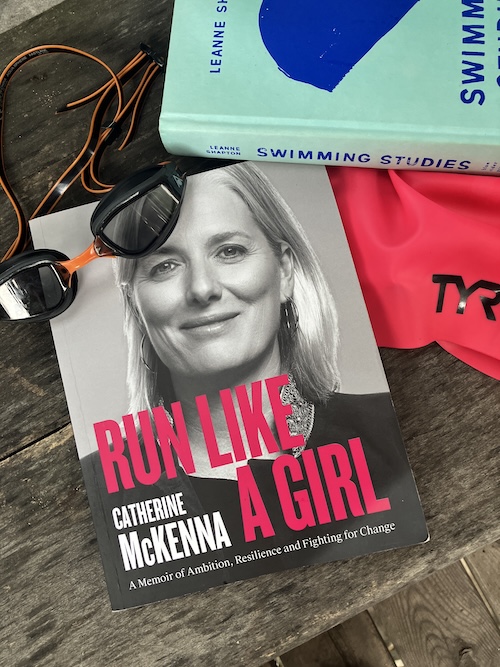 RUN LIKE A GIRL, the memoir by former MP and Environment Minister Catherine McKenna, was an impulse buy. I picked it up at the bookstore because I was curious about who’d published it (it was Sutherland House Publishing) and discovered that it was more of a scrapbook than a typical memoir, like those SOUVENIR OF CANADA books that Douglas Coupland published about 20 years ago, replete with snapshots, clippings, photos of objects (the shoes she wore canvassing, her collection of swim caps, an array of campaign buttons, the cover of U2’s WAR, the first album McKenna ever bought), Nike ads she cut out of magazines and taped on her bedroom wall during the ’90s (which is both cringe AND very relatable), along with short passages of text. I was drawn by the book’s format and also interested in McKenna’s story as a female politician who’d received outsized hate and abuse during her tenure (there are people thought they were being clever by calling her “Climate Barbie”), so I took the book home…where I read her acknowledgements and discovered that the book’s unique format was dreamed up in the company of McKenna’s “swim friend,” Leanne Shapton, whose own books which are collections of objects and images are some of my favourites, her memoir SWIMMING STUDIES in particular. So of course I wanted to read RUN LIKE A GIRL. (If McKenna had called her book SWIM LIKE A GIRL, I would have purchased with more alacrity, but possibly I am a niche audience for that.)