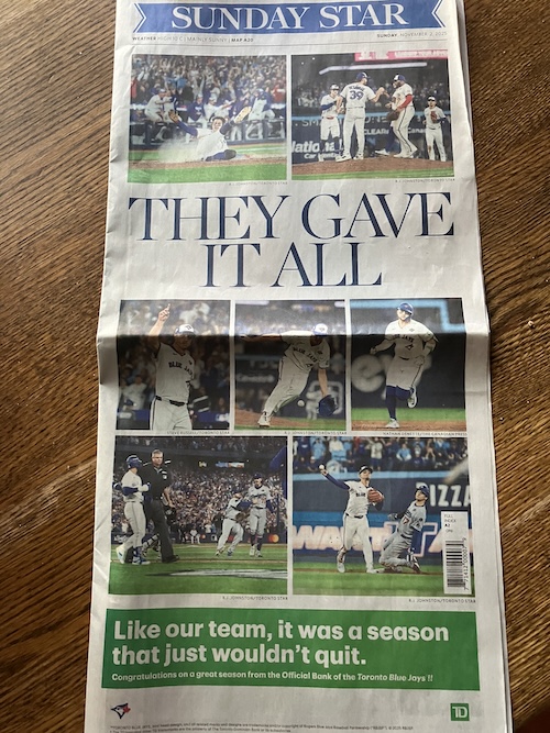 It feels good to be part of a beautiful story, which was a chief appeal of jumping on the Blue Jays post-season bandwagon this year. The bandwagon has been an experience that echoed last year’s of Tay-ronto, when the Taylor Swift Eras tour arrived in our city and the vibes were so electric that one was even able to be a functional human being in spite of an American election outcome concurrently that was just devastating. Both of these collective experiences were so restorative for me, and when I’m called on to articulate why, the image comes to mind of boarded up windows across downtown Toronto in June of 2020 in the wake of the George Floyd protests after we’d just lived through a season of lockdown, the insult and injury of all that ugly plywood, and then eventual weekly “convoy” protests just blocks from my house that were loud, mean, and as antisocial as they were stupid. It’s been a hard five years, a hard ten years, and things are still hard, and scary, so much of what we feared at those election results last year having come to pass, and then some. And along the way I’d lost my faith and trust in community, and in any certainty I’d had about what our story was and just where we were going.