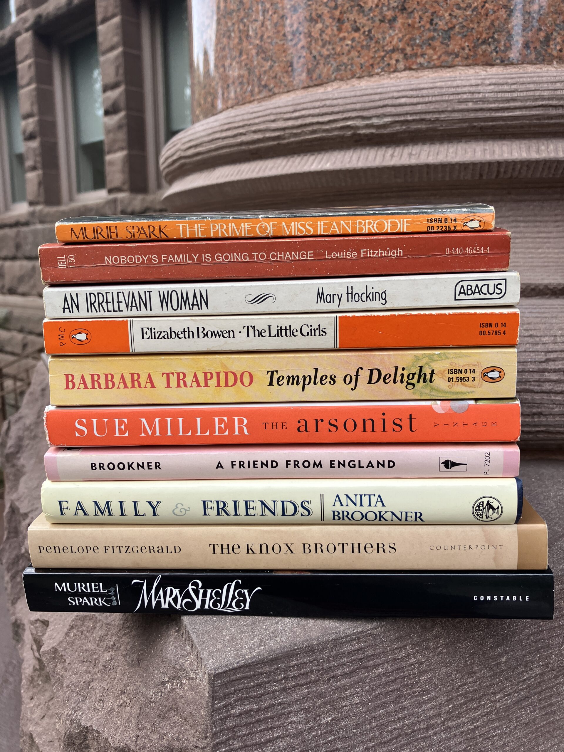 Another year, another stack from the Victoria College Book Sale. Which was wonderful, but HOT and crowded, and I was very tired, and also nostalgic for the days when I had not yet acquired all the books by beloved authors like Margaret Drabble and Penelope Lively, when the pickings seemed easy. But that’s what makes it all the more miraculous to discover gems like the last remaining Sue Miller novel I have yet to read, and also Barbara Trapido (whose novels don’t turn up much in Canada). And a very hard-to-find Louise Fitzhugh novel, which is not a novel without problems, but any Louise Fitzhugh book is worth my time (I read a library copy years ago). Penelope Fitzgerald’s bio of her father and his brothers! Muriel Spark on Mary Shelley (WHAT???). A couple of Anita Brooker’s (one first edition!), an Elizabeth Bowen, and one more by Mary Hocking, whom I’ve read once before and I’m not completely sure I’m on board but we shall see…
