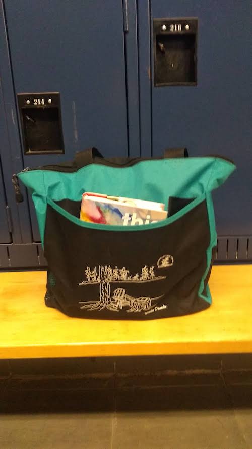 This bag is especially precious to me because it’s my swim bag, ever ready, containing the essentials: suit, towel, hair towel, sandals, goggles, and my locker lock.